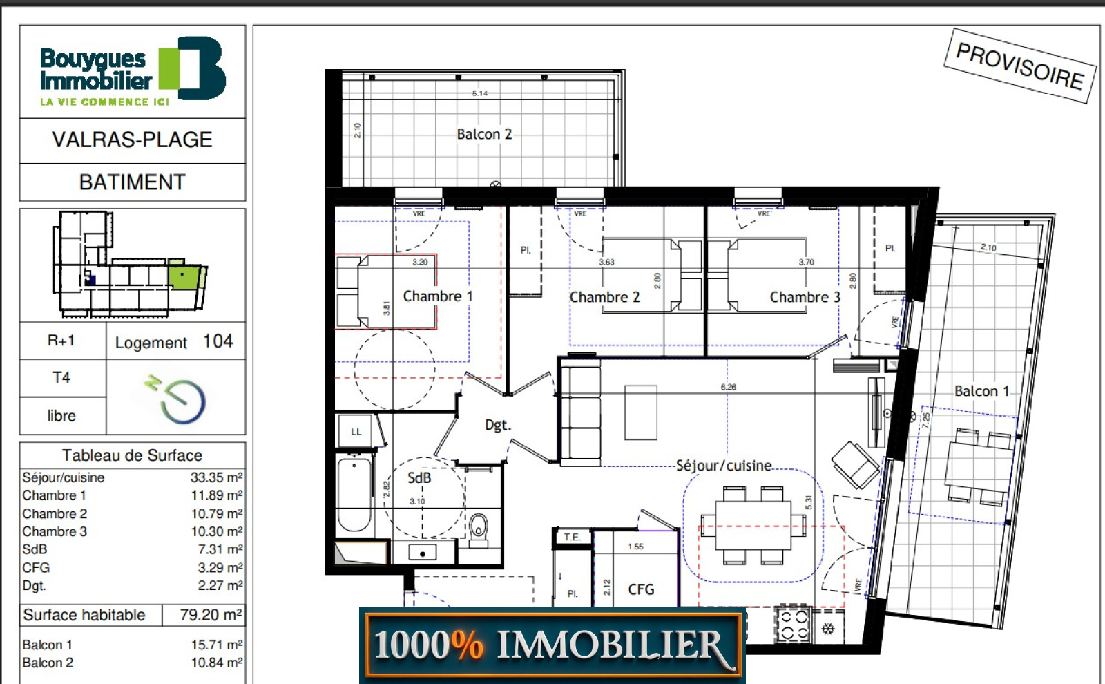 1000% IMMOBILIER (partenaire Bouygues Immobilier) vous propose : dans le cadre d'un programme neuf à 150 mètres des plages environ : un T4 au premier étage de 79.20m² environ avec 2 balcons de 15.71m² environ et 10.84m² + 2 places de parking privée. Séjour 33.35m² environ, 1 chambre 11.89m², 1 chambre de 10.79m², 1 chambre de 10.30m², un cellier de 3.29m², 1 salle de bains/WC : 7.31m² et un dégagement central. Pompe à chaleur (climatisation réversible). Carrelage 60/60 (plusieurs choix possibles). 2 couches de peintures blanches (mat ou satiné). Un ballon thermodynamique collectif pour l’eau chaude sanitaire et un chauffage électrique individuel. Volets roulants électriques. Double vitrage. DPE en A. Normes RE 2020. Résidence de 46 appartements à taille humaine. Cuisine équipée avec four offerte jusqu'au 30/05/2025 + Pass'Invest. TVA 20%. Fiscalité : LMNP/LMP/LLI/RP. Réalisation : Bouygues Immobilier. Livraison : 4ème trimestre 2027. Sous garantie jusqu'en 2037. Frais de notaires réduits: 6200€ environ. D'autres lots disponibles du studio au T4. Pour tous renseignements ou une visite des lieux, contactez-nous au 06 63 34 41 43.